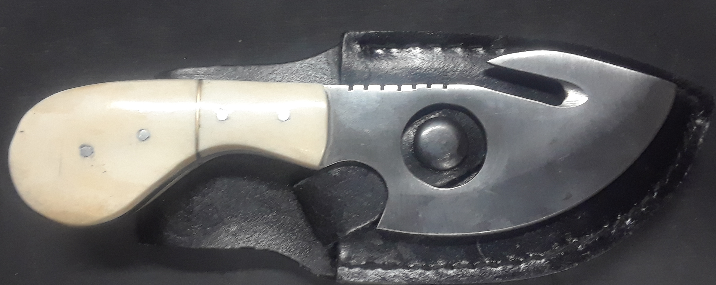 A Hand made Gut-hook skinning knife crafted from 440 Pakistan steel, with a bone handle for a more comfortable grip. A must for hunter’s, and Enthusiasts alike! We include free shipping, and we currently only ship in the U.S.A!