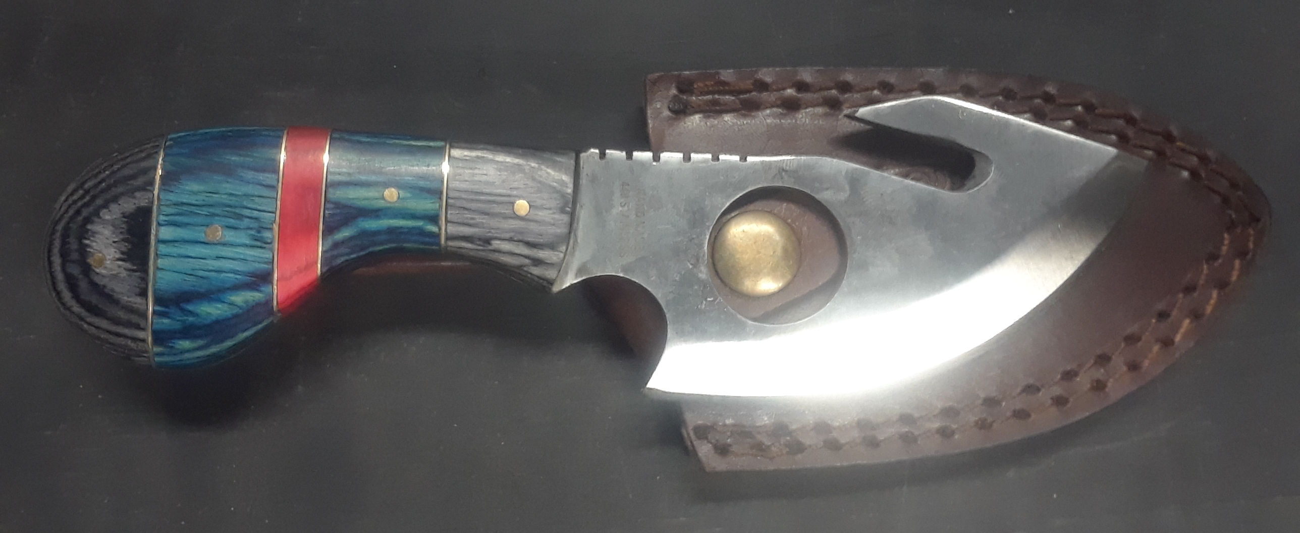 A fine Handmade Guthook skinning knife crafted from 440 Pakistan steel, with a pakkawood handle. A must for Knife Enthusiasts, and Hunter’s alike. Perfect for Fishing, or hunting. We currently only ship in the U.S.A and all transactions include free shipping!