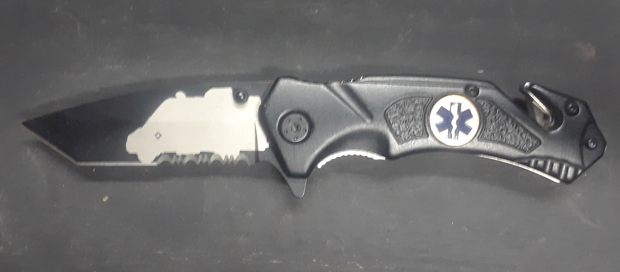 To show our appreciation for E.M.S Workers, Dwarfblades presents the E.M.S Pocket Knife equipped with a handy Glass Breaker, and SeatBelt line cutter. The blade itself features a serrated edge for more bite. We currently only ship in the U.S.A, and we include free shipping!