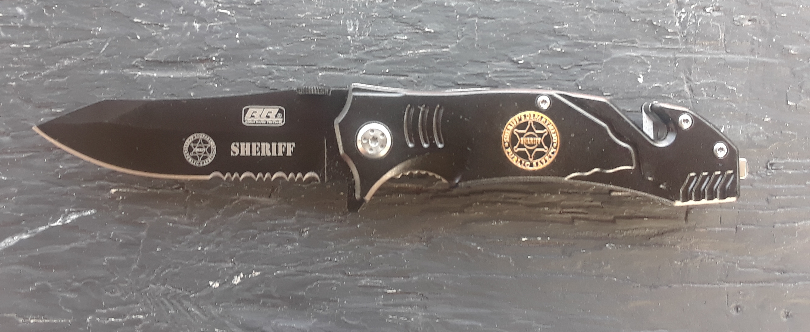 Sheriff Pocket Knife equipped with a glass breaker, and seat belt line cutter looking to represent, and show your support for our Law Enforcement! We include free shipping, and we currently only ship in the U.S.A!