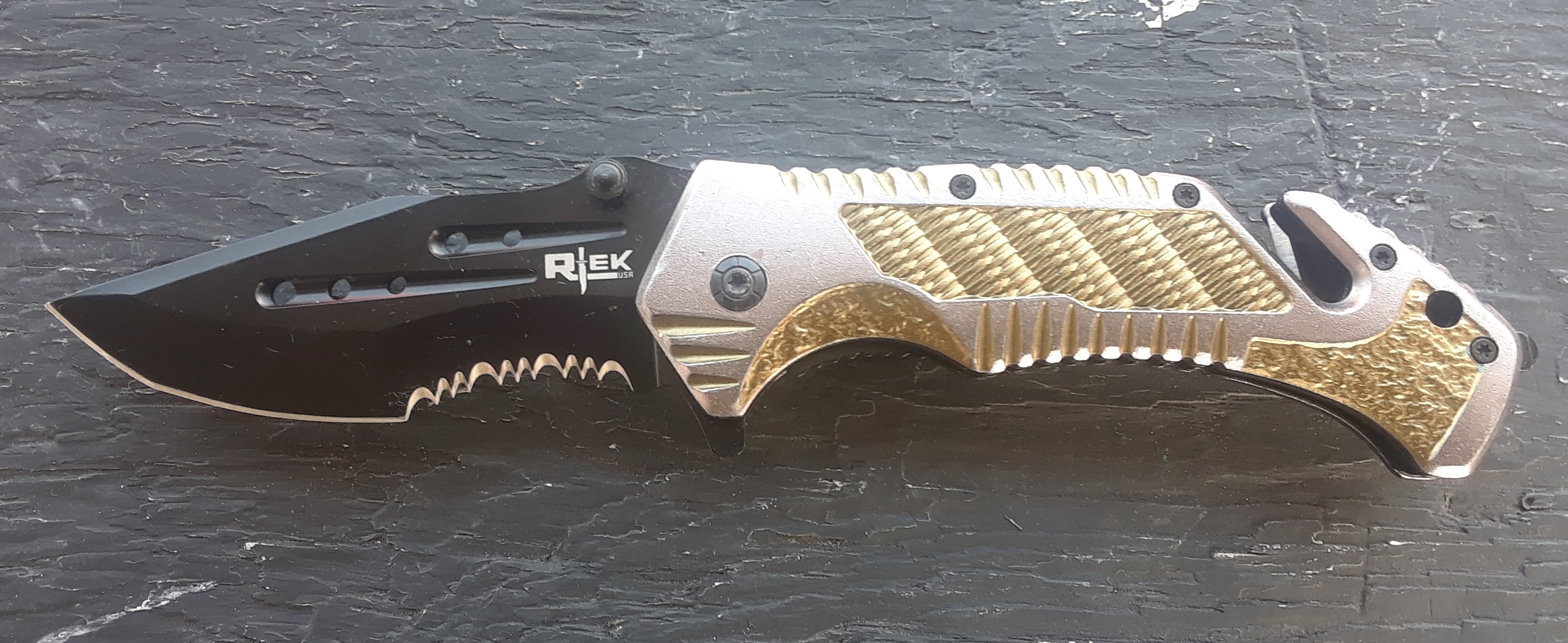 The Rtek Pocket Knife Equipped with a Glass Breaker, and Seat Belt Line Cutter with comfortable metal handle a must for collectors, and enthusiasts alike!